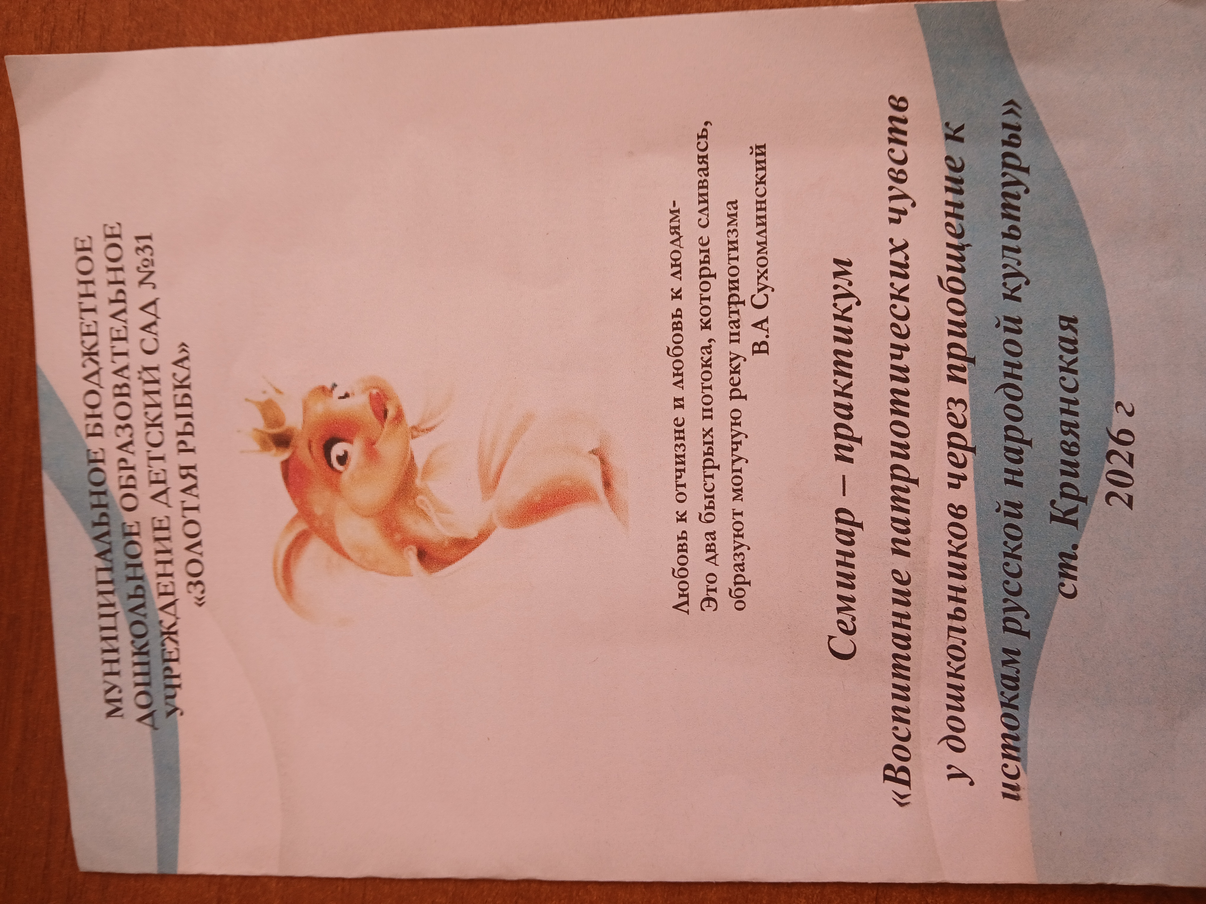 25 марта в МБДОУ № 31 «Золотая рыбка» ст. Кривянской, состоялось методическое объединение для воспитателей по теме: «Воспитание патриотических чувств у дошкольников через приобщение к истокам русской народной культуры». В ходе семинара был представлен опыт работы детского сада по созданию развивающей среды, использование народного фольклора во всех его проявлениях (сказки, пословицы, поговорки, загадки, песенки, частушки, хороводы и др., знакомство с традиционными и обрядовыми праздниками, с русскими народными играми. Семинар стал площадкой для обмена знаниями и идеями, а также позволило участникам найти новые подходы к внедрению русских традиций в образовательном процессе.